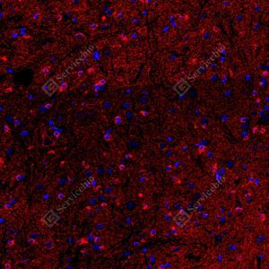 | IF检测FIS1蛋白(货号 GB150136)(红色). 样品: 大鼠脊髓, 4%多聚甲醛 (货号G1101) 固定12-24小时. 抗原修复: 抗原修复仪 (货号 ARI-4),Tris-EDTA抗原修复液(pH 9.0) (货号G1203), 水浴90℃, 30分钟. 封闭: 3% BSA(货号GC305010)的PBS溶液, 室温孵育30分钟. —抗: 1: 1000稀释, 4℃ 孵育过夜. 二抗: Cy3标记山羊抗兔IgG (H+L) (货号GB21303), 1: 300稀释, 室温孵育1小时. |