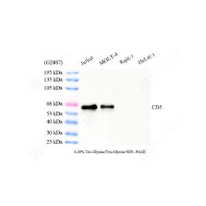 | WB检测CD5蛋白(货号 GB151360). 样品: 经RIPA裂解液(货号G2002)处理的蛋白质. 封闭: 3%脱脂牛奶(货号GC310001)溶于TBST溶液, 室温孵育1小时. —抗: 1: 500稀释, 4℃ 孵育过夜. 二抗: HRP标记山羊抗小鼠IgG (H+L) (货号GB23301), 1: 5000稀释, 室温孵育1小时. |