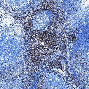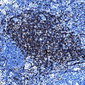 | IHC检测CD5蛋白(货号 GB151360). 样品: 人扁桃体, 4%多聚甲醛 (货号G1101) 固定12-24小时. 抗原修复: Tris-EDTA抗原修复液(pH 9.0) (G1203), 100℃, 25分钟. —抗: 1: 2000稀释, 4℃ 孵育过夜. 二抗: S-vision免疫组化多聚二抗(山羊抗小鼠), 即用型(货号G1301), 室温孵育20分钟. |