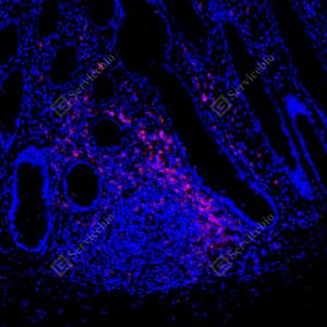 | IF检测CD5蛋白(货号 GB151360)(红色). 样品: 人结肠, 4%多聚甲醛 (货号G1101) 固定12-24小时. 抗原修复: Tris-EDTA抗原修复液(pH 9.0) (G1203), 100℃, 25分钟. 封闭: 3% BSA(货号GC305010)的PBS溶液, 室温孵育30分钟. —抗: 1: 2000稀释, 4℃ 孵育过夜. 二抗: Cy3标记山羊抗小鼠IgG (H+L) (货号GB21301), 1: 300稀释, 室温孵育1小时. |