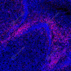 | IF检测CD5蛋白(货号 GB151360)(红色). 样品: 人扁桃体, 4%多聚甲醛 (货号G1101) 固定12-24小时. 抗原修复: Tris-EDTA抗原修复液(pH 9.0) (G1203), 100℃, 25分钟. 封闭: 3% BSA(货号GC305010)的PBS溶液, 室温孵育30分钟. —抗: 1: 2000稀释, 4℃ 孵育过夜. 二抗: Cy3标记山羊抗小鼠IgG (H+L) (货号GB21301), 1: 300稀释, 室温孵育1小时. |