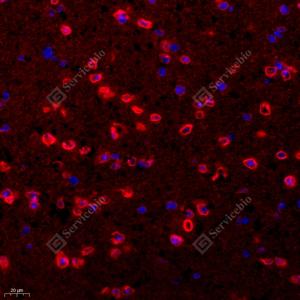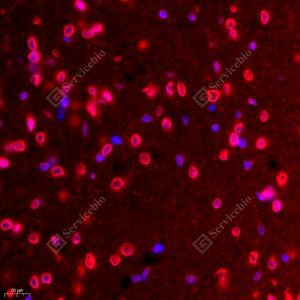 IF检测Tuba3a蛋白(货号 GB112245)(红色). 样品: 小鼠纹状体, 4%多聚甲醛 (货号G1101) 固定12-24小时. 抗原修复: Tris-EDTA抗原修复液(pH 9.0) (G1203), 98℃, 20分钟. 封闭: 3% BSA(货号GC305010)的PBS溶液, 室温孵育30分钟. —抗: 1: 600稀释, 4℃ 孵育过夜. 二抗: Cy3标记山羊抗兔IgG (H+L) (货号GB21303), 1: 300稀释, 室温孵育1小时. |