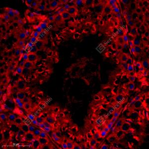 IF检测Tuba3a蛋白(货号 GB112245)(红色). 样品: 大鼠睾丸, 4%多聚甲醛 (货号G1101) 固定12-24小时. 抗原修复: Tris-EDTA抗原修复液(pH 9.0) (G1203), 98℃, 20分钟. 封闭: 3% BSA(货号GC305010)的PBS溶液, 室温孵育30分钟. —抗: 1: 600稀释, 4℃ 孵育过夜. 二抗: Cy3标记山羊抗兔IgG (H+L) (货号GB21303), 1: 300稀释, 室温孵育1小时. |