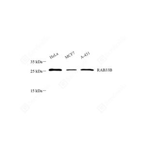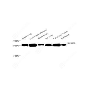 WB检测RAB33B蛋白(货号 GB114745). 样品: 经RIPA裂解液(货号G2002)处理的蛋白质. 封闭: 封闭: 3%脱脂牛奶(货号GC310001)溶于TBST溶液, 室温孵育1小时. —抗: 1: 2000稀释, 4℃ 孵育过夜. 二抗: HRP标记山羊抗兔IgG (H+L) (货号GB23303), 1: 5000稀释, 室温孵育1小时. |