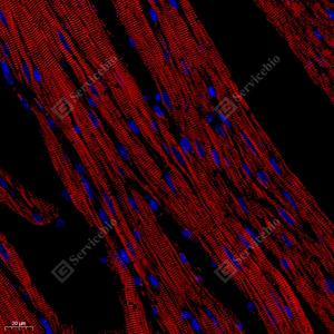 | IF检测RAB8B蛋白(货号 GB114695)(红色). 样品: 大鼠心, 4%多聚甲醛 (货号G1101) 固定12-24小时. 抗原修复: Tris-EDTA抗原修复液(pH 9.0) (G1203), 98℃, 20分钟. 封闭: 3% BSA(货号GC305010)的PBS溶液, 室温孵育30分钟. —抗: 1: 1000稀释, 4℃ 孵育过夜. 二抗: Cy3标记山羊抗兔IgG (H+L) (货号GB21303), 1: 300稀释, 室温孵育1小时. |