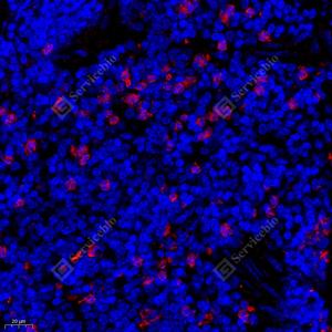 | IF检测RAB8B蛋白(货号 GB114695)(红色). 样品: 小鼠脾, 4%多聚甲醛 (货号G1101) 固定12-24小时. 抗原修复: Tris-EDTA抗原修复液(pH 9.0) (G1203), 98℃, 20分钟. 封闭: 3% BSA(货号GC305010)的PBS溶液, 室温孵育30分钟. —抗: 1: 1000稀释, 4℃ 孵育过夜. 二抗: Cy3标记山羊抗兔IgG (H+L) (货号GB21303), 1: 300稀释, 室温孵育1小时. |