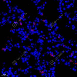 | IF检测RAB8B蛋白(货号 GB114695)(红色). 样品: 小鼠肺, 4%多聚甲醛 (货号G1101) 固定12-24小时. 抗原修复: Tris-EDTA抗原修复液(pH 9.0) (G1203), 98℃, 20分钟. 封闭: 3% BSA(货号GC305010)的PBS溶液, 室温孵育30分钟. —抗: 1: 1000稀释, 4℃ 孵育过夜. 二抗: Cy3标记山羊抗兔IgG (H+L) (货号GB21303), 1: 300稀释, 室温孵育1小时. |
