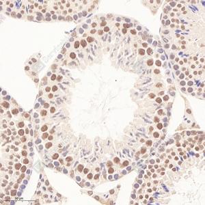 IHC检测RanBP9蛋白(货号 GB113228). 样品: 小鼠睾丸, 4%多聚甲醛 (货号G1101) 固定12-24小时. 抗原修复: Tris-EDTA抗原修复液(pH 9.0) (G1203), 98℃, 20分钟. —抗: 1: 4000稀释, 4℃ 孵育过夜. 二抗: HRP标记山羊抗兔IgG (H+L) (货号GB23303), 1: 200稀释, 室温孵育1小时. |