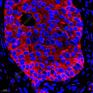IF检测RAP2C蛋白(货号 GB112424)(红色). 样品: 人乳腺癌, 4%多聚甲醛 (货号G1101) 固定12-24小时. 抗原修复: Tris-EDTA抗原修复液(pH 9.0) (G1203), 98℃, 20分钟. 封闭: 3% BSA(货号GC305010)的PBS溶液, 室温孵育30分钟. —抗: 1: 700稀释, 4℃ 孵育过夜. 二抗: Cy3标记山羊抗兔IgG (H+L) (货号GB21303), 1: 300稀释, 室温孵育1小时. |