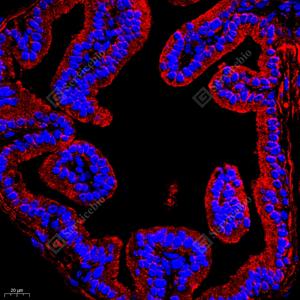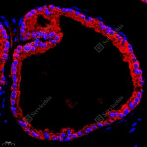 IF检测RAP2C蛋白(货号 GB112424)(红色). 样品: 大鼠前列腺, 4%多聚甲醛 (货号G1101) 固定12-24小时. 抗原修复: Tris-EDTA抗原修复液(pH 9.0) (G1203), 98℃, 20分钟. 封闭: 3% BSA(货号GC305010)的PBS溶液, 室温孵育30分钟. —抗: 1: 700稀释, 4℃ 孵育过夜. 二抗: Cy3标记山羊抗兔IgG (H+L) (货号GB21303), 1: 300稀释, 室温孵育1小时. |