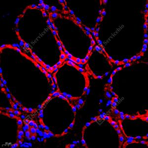 IF检测RAP2C蛋白(货号 GB112424)(红色). 样品: 小鼠甲状旁腺, 4%多聚甲醛 (货号G1101) 固定12-24小时. 抗原修复: Tris-EDTA抗原修复液(pH 9.0) (G1203), 98℃, 20分钟. 封闭: 3% BSA(货号GC305010)的PBS溶液, 室温孵育30分钟. —抗: 1: 700稀释, 4℃ 孵育过夜. 二抗: Cy3标记山羊抗兔IgG (H+L) (货号GB21303), 1: 300稀释, 室温孵育1小时. |