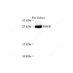 WB检测RhoF蛋白(货号 GB114363). 样品: 经RIPA裂解液(货号G2002)处理的蛋白质. 封闭: 封闭: 3%脱脂牛奶(货号GC310001)溶于TBST溶液, 室温孵育1小时. —抗: 1: 500稀释, 4℃ 孵育过夜. 二抗: HRP标记山羊抗兔IgG (H+L) (货号GB23303), 1: 5000稀释, 室温孵育1小时. |
