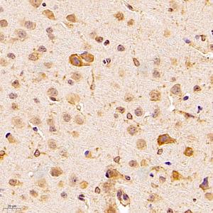 IHC检测Socius蛋白(货号 GB112594). 样品: 大鼠脑, 4%多聚甲醛 (货号G1101) 固定12-24小时. 抗原修复: 柠檬酸抗原修复液(干粉, pH 6.0) (G1201), 98℃, 20分钟. —抗: 1: 2000稀释, 4℃ 孵育过夜. 二抗: HRP标记山羊抗兔IgG (H+L) (货号GB23303), 1: 200稀释, 室温孵育1小时. |
