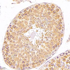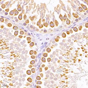 IHC检测Socius蛋白(货号 GB112594). 样品: 小鼠睾丸, 4%多聚甲醛 (货号G1101) 固定12-24小时. 抗原修复: 柠檬酸抗原修复液(干粉, pH 6.0) (G1201), 98℃, 20分钟. —抗: 1: 2000稀释, 4℃ 孵育过夜. 二抗: HRP标记山羊抗兔IgG (H+L) (货号GB23303), 1: 200稀释, 室温孵育1小时. |