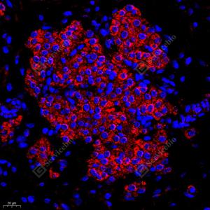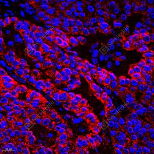 IF检测Socius蛋白(货号 GB112594)(红色). 样品: 人卵巢癌, 4%多聚甲醛 (货号G1101) 固定12-24小时. 抗原修复: Tris-EDTA抗原修复液(pH 9.0) (G1203), 98℃, 20分钟. 封闭: 3% BSA(货号GC305010)的PBS溶液, 室温孵育30分钟. —抗: 1: 650稀释, 4℃ 孵育过夜. 二抗: Cy3标记山羊抗兔IgG (H+L) (货号GB21303), 1: 300稀释, 室温孵育1小时. |