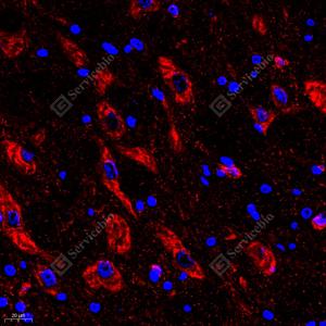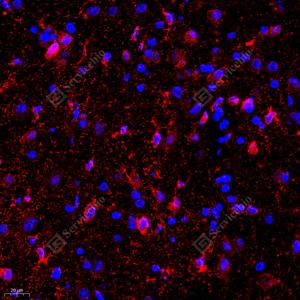 IF检测Socius蛋白(货号 GB112594)(红色). 样品: 小鼠脑, 4%多聚甲醛 (货号G1101) 固定12-24小时. 抗原修复: Tris-EDTA抗原修复液(pH 9.0) (G1203), 98℃, 20分钟. 封闭: 3% BSA(货号GC305010)的PBS溶液, 室温孵育30分钟. —抗: 1: 650稀释, 4℃ 孵育过夜. 二抗: Cy3标记山羊抗兔IgG (H+L) (货号GB21303), 1: 300稀释, 室温孵育1小时. |