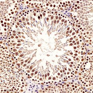 IHC检测TBC1D1蛋白(货号 GB11901). 样品: 大鼠睾丸, 4%多聚甲醛 (货号G1101) 固定12-24小时. 抗原修复: 柠檬酸抗原修复液(干粉, pH 6.0) (G1201), 98℃, 20分钟. —抗: 1: 2000稀释, 4℃ 孵育过夜. 二抗: HRP标记山羊抗兔IgG (H+L) (货号GB23303), 1: 200稀释, 室温孵育1小时. |