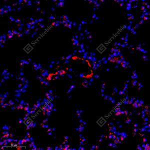IF检测TBC1D1蛋白(货号 GB11901)(红色). 样品: 小鼠肺炎, 4%多聚甲醛 (货号G1101) 固定12-24小时. 抗原修复: Tris-EDTA抗原修复液(pH 9.0) (G1203), 98℃, 20分钟. 封闭: 3% BSA(货号GC305010)的PBS溶液, 室温孵育30分钟. —抗: 1: 1000稀释, 4℃ 孵育过夜. 二抗: Cy3标记山羊抗兔IgG (H+L) (货号GB21303), 1: 300稀释, 室温孵育1小时. |