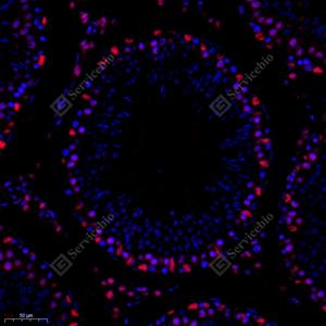 IF检测TBC1D1蛋白(货号 GB11901)(红色). 样品: 大鼠睾丸, 4%多聚甲醛 (货号G1101) 固定12-24小时. 抗原修复: Tris-EDTA抗原修复液(pH 9.0) (G1203), 98℃, 20分钟. 封闭: 3% BSA(货号GC305010)的PBS溶液, 室温孵育30分钟. —抗: 1: 1000稀释, 4℃ 孵育过夜. 二抗: Cy3标记山羊抗兔IgG (H+L) (货号GB21303), 1: 300稀释, 室温孵育1小时. |
