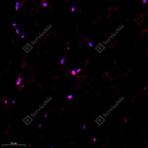 IF检测TBC1D1蛋白(货号 GB11901)(红色). 样品: 大鼠脂肪, 4%多聚甲醛 (货号G1101) 固定12-24小时. 抗原修复: Tris-EDTA抗原修复液(pH 9.0) (G1203), 98℃, 20分钟. 封闭: 3% BSA(货号GC305010)的PBS溶液, 室温孵育30分钟. —抗: 1: 1000稀释, 4℃ 孵育过夜. 二抗: Cy3标记山羊抗兔IgG (H+L) (货号GB21303), 1: 300稀释, 室温孵育1小时. |