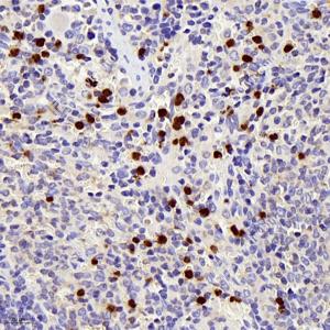 IHC检测MRP8蛋白(货号 GB11421). 样品: 大鼠脾, 4%多聚甲醛 (货号G1101) 固定12-24小时. 抗原修复: 柠檬酸抗原修复液(干粉, pH 6.0) (G1201), 98℃, 20分钟. —抗: 1: 1500稀释, 4℃ 孵育过夜. 二抗: HRP标记山羊抗兔IgG (H+L) (货号GB23303), 1: 200稀释, 室温孵育1小时. |