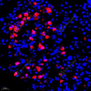 IF检测MRP8蛋白(货号 GB11421)(红色). 样品: 小鼠脾, 4%多聚甲醛 (货号G1101) 固定12-24小时. 抗原修复: Tris-EDTA抗原修复液(pH 9.0) (G1203), 98℃, 20分钟. 封闭: 3% BSA(货号GC305010)的PBS溶液, 室温孵育30分钟. —抗: 1: 1500稀释, 4℃ 孵育过夜. 二抗: Cy3标记山羊抗兔IgG (H+L) (货号GB21303), 1: 300稀释, 室温孵育1小时. |