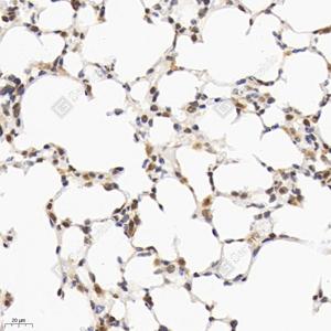 | IHC检测Smad2 + Smad3蛋白(货号 GB111844). 样品: 小鼠肺损伤, 4%多聚甲醛 (货号G1101) 固定12-24小时. 抗原修复: 柠檬酸抗原修复液(干粉, pH 6.0) (G1201), 高压锅均匀喷气计时2分钟. —抗: 1: 500稀释, 4℃ 孵育过夜. 二抗: HRP标记山羊抗兔IgG (H+L) (货号GB23303), 1: 200稀释, 室温孵育1小时. |
