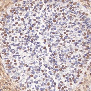 | IHC检测Smad2 + Smad3蛋白(货号 GB111844). 样品: 大鼠卵巢, 4%多聚甲醛 (货号G1101) 固定12-24小时. 抗原修复: 柠檬酸抗原修复液(干粉, pH 6.0) (G1201), 高压锅均匀喷气计时2分钟. —抗: 1: 800稀释, 4℃ 孵育过夜. 二抗: HRP标记山羊抗兔IgG (H+L) (货号GB23303), 1: 200稀释, 室温孵育1小时. |