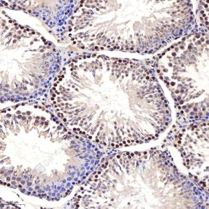 IHC检测GSK3 beta蛋白(货号 GB11099). 样品: 大鼠睾丸, 4%多聚甲醛 (货号G1101) 固定12-24小时. 抗原修复: 柠檬酸抗原修复液(干粉, pH 6.0) (G1201), 98℃, 20分钟. —抗: 1: 1000稀释, 4℃ 孵育过夜. 二抗: HRP标记山羊抗兔IgG (H+L) (货号GB23303), 1: 200稀释, 室温孵育1小时. |