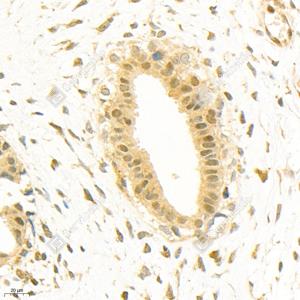 IHC检测GSK3 beta蛋白(货号 GB11835). 样品: 人乳腺癌, 4%多聚甲醛 (货号G1101) 固定12-24小时. 抗原修复: 柠檬酸抗原修复液(干粉, pH 6.0) (G1201), 98℃, 20分钟. —抗: 1: 1500稀释, 4℃ 孵育过夜. 二抗: HRP标记山羊抗兔IgG (H+L) (货号GB23303), 1: 200稀释, 室温孵育1小时. |