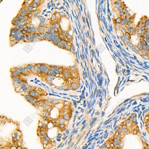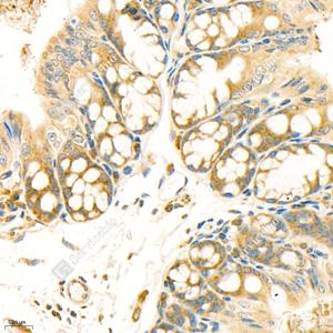IHC检测GSK3 beta蛋白(货号 GB11835). 样品: 结肠, 4%多聚甲醛 (货号G1101) 固定12-24小时. 抗原修复: 柠檬酸抗原修复液(干粉, pH 6.0) (G1201), 98℃, 20分钟. —抗: 1: 1500稀释, 4℃ 孵育过夜. 二抗: HRP标记山羊抗兔IgG (H+L) (货号GB23303), 1: 200稀释, 室温孵育1小时. |
