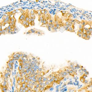 IHC检测GSK3 beta蛋白(货号 GB11835). 样品: 小鼠卵巢, 4%多聚甲醛 (货号G1101) 固定12-24小时. 抗原修复: 柠檬酸抗原修复液(干粉, pH 6.0) (G1201), 98℃, 20分钟. —抗: 1: 1500稀释, 4℃ 孵育过夜. 二抗: HRP标记山羊抗兔IgG (H+L) (货号GB23303), 1: 200稀释, 室温孵育1小时. |