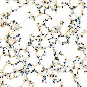IHC检测GSK3 beta蛋白(货号 GB11835). 样品: 肺, 4%多聚甲醛 (货号G1101) 固定12-24小时. 抗原修复: 柠檬酸抗原修复液(干粉, pH 6.0) (G1201), 98℃, 20分钟. —抗: 1: 1500稀释, 4℃ 孵育过夜. 二抗: HRP标记山羊抗兔IgG (H+L) (货号GB23303), 1: 200稀释, 室温孵育1小时. |