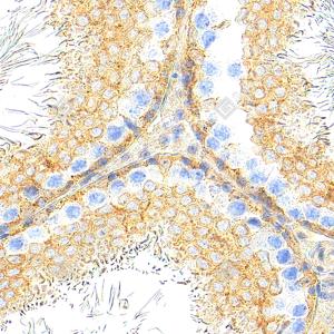 IHC检测GSK3 beta蛋白(货号 GB12835). 样品: 大鼠睾丸, 4%多聚甲醛 (货号G1101) 固定12-24小时. 抗原修复: Tris-EDTA抗原修复液(pH 9.0) (G1203), 98℃, 20分钟. —抗: 1: 1000稀释, 4℃ 孵育过夜. 二抗: S-vision免疫组化多聚二抗(山羊抗小鼠), 即用型(货号G1301), 室温孵育20分钟. |
