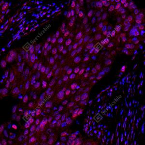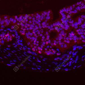 IF检测GSK3 beta蛋白(货号 GB12835)(红色). 样品: 人子宫内膜癌, 4%多聚甲醛 (货号G1101) 固定12-24小时. 抗原修复: Tris-EDTA抗原修复液(pH 9.0) (货号G1203), 高压锅均匀喷气计时2分钟. 封闭: 3% BSA(货号GC305010)的PBS溶液, 室温孵育30分钟. —抗: 1: 500稀释, 4℃ 孵育过夜. 二抗: Cy3标记山羊抗小鼠IgG (H+L) (货号GB21301), 1: 300稀释, 室温孵育1小时. |