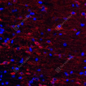 IF检测GSK3 beta蛋白(货号 GB12835)(红色). 样品: 大鼠脑, 4%多聚甲醛 (货号G1101) 固定12-24小时. 抗原修复: Tris-EDTA抗原修复液(pH 9.0) (货号G1203), 高压锅均匀喷气计时2分钟. 封闭: 3% BSA(货号GC305010)的PBS溶液, 室温孵育30分钟. —抗: 1: 500稀释, 4℃ 孵育过夜. 二抗: Cy3标记山羊抗小鼠IgG (H+L) (货号GB21301), 1: 300稀释, 室温孵育1小时. |