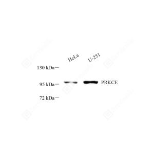 WB检测PKC蛋白(货号 GB113782). 样品: 经RIPA裂解液(货号G2002)处理的蛋白质. 封闭: 3%脱脂牛奶(货号GC310001)溶于TBST溶液, 室温孵育1小时. —抗: 1: 500稀释, 4℃ 孵育过夜. 二抗: HRP标记山羊抗兔IgG (H+L) (货号GB23303), 1: 5000稀释, 室温孵育1小时. |