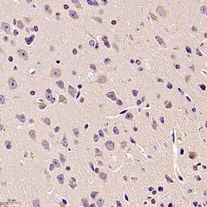 IHC检测NEK7蛋白(货号 GB112643). 样品: 小鼠脑, 4%多聚甲醛 (货号G1101) 固定12-24小时. 抗原修复: 柠檬酸抗原修复液(干粉, pH 6.0) (G1201), 98℃, 20分钟. —抗: 1: 300稀释, 4℃ 孵育过夜. 二抗: HRP标记山羊抗兔IgG (H+L) (货号GB23303), 1: 200稀释, 室温孵育1小时. |