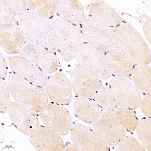 IHC检测NEK7蛋白(货号 GB112643). 样品: 小鼠骨骼肌, 4%多聚甲醛 (货号G1101) 固定12-24小时. 抗原修复: 柠檬酸抗原修复液(干粉, pH 6.0) (G1201), 98℃, 20分钟. —抗: 1: 200稀释, 4℃ 孵育过夜. 二抗: HRP标记山羊抗兔IgG (H+L) (货号GB23303), 1: 200稀释, 室温孵育1小时. |