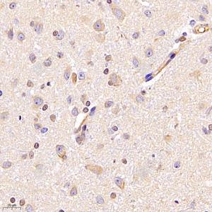 IHC检测NEK7蛋白(货号 GB112643). 样品: 大鼠脑, 4%多聚甲醛 (货号G1101) 固定12-24小时. 抗原修复: 柠檬酸抗原修复液(干粉, pH 6.0) (G1201), 98℃, 20分钟. —抗: 1: 300稀释, 4℃ 孵育过夜. 二抗: HRP标记山羊抗兔IgG (H+L) (货号GB23303), 1: 200稀释, 室温孵育1小时. |