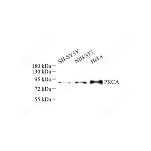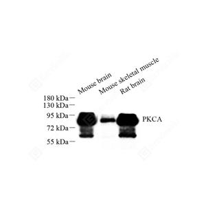 WB检测PKC alpha蛋白(货号 GB11650). 样品: 经RIPA裂解液(货号G2002)处理的蛋白质. 封闭: 封闭: 3%脱脂牛奶(货号GC310001)溶于TBST溶液, 室温孵育1小时. —抗: 1: 500稀释, 4℃ 孵育过夜. 二抗: HRP标记山羊抗兔IgG (H+L) (货号GB23303), 1: 5000稀释, 室温孵育1小时. |