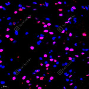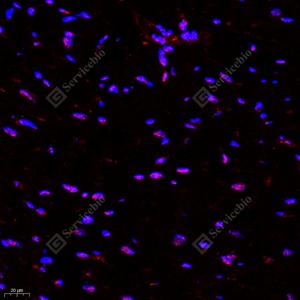 IF检测PKC alpha蛋白(货号 GB11649)(红色). 样品: 小鼠心, 4%多聚甲醛 (货号G1101) 固定12-24小时. 抗原修复: Tris-EDTA抗原修复液(pH 9.0) (G1203), 98℃, 20分钟. 封闭: 3% BSA(货号GC305010)的PBS溶液, 室温孵育30分钟. —抗: 1: 2000稀释, 4℃ 孵育过夜. 二抗: Cy3标记山羊抗兔IgG (H+L) (货号GB21303), 1: 300稀释, 室温孵育1小时. |