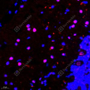 IF检测PKC alpha蛋白(货号 GB11649)(红色). 样品: 小鼠脑, 4%多聚甲醛 (货号G1101) 固定12-24小时. 抗原修复: Tris-EDTA抗原修复液(pH 9.0) (G1203), 98℃, 20分钟. 封闭: 3% BSA(货号GC305010)的PBS溶液, 室温孵育30分钟. —抗: 1: 2000稀释, 4℃ 孵育过夜. 二抗: Cy3标记山羊抗兔IgG (H+L) (货号GB21303), 1: 300稀释, 室温孵育1小时. |