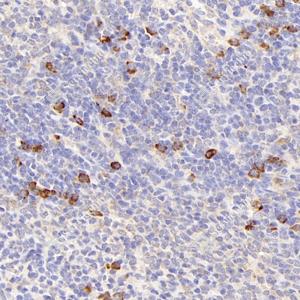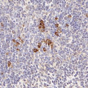 IHC检测AMHR2蛋白(货号 GB114029). 样品: 小鼠脾, 4%多聚甲醛 (货号G1101) 固定12-24小时. 抗原修复: 柠檬酸抗原修复液(干粉, pH 6.0) (G1201), 98℃, 20分钟. —抗: 1: 600稀释, 4℃ 孵育过夜. 二抗: HRP标记山羊抗兔IgG (H+L) (货号GB23303), 1: 200稀释, 室温孵育1小时. |