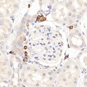 IHC检测AMHR2蛋白(货号 GB114029). 样品: 大鼠肾, 4%多聚甲醛 (货号G1101) 固定12-24小时. 抗原修复: 柠檬酸抗原修复液(干粉, pH 6.0) (G1201), 98℃, 20分钟. —抗: 1: 600稀释, 4℃ 孵育过夜. 二抗: HRP标记山羊抗兔IgG (H+L) (货号GB23303), 1: 200稀释, 室温孵育1小时. |