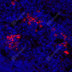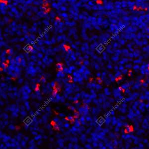 IF检测AMHR2蛋白(货号 GB114029)(红色). 样品: 小鼠脾, 4%多聚甲醛 (货号G1101) 固定12-24小时. 抗原修复: Tris-EDTA抗原修复液(pH 9.0) (G1203), 98℃, 20分钟. 封闭: 3% BSA(货号GC305010)的PBS溶液, 室温孵育30分钟. —抗: 1: 300稀释, 4℃ 孵育过夜. 二抗: Cy3标记山羊抗兔IgG (H+L) (货号GB21303), 1: 300稀释, 室温孵育1小时. |
