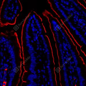 IF检测AMHR2蛋白(货号 GB114029)(红色). 样品: 小鼠小肠, 4%多聚甲醛 (货号G1101) 固定12-24小时. 抗原修复: Tris-EDTA抗原修复液(pH 9.0) (G1203), 98℃, 20分钟. 封闭: 3% BSA(货号GC305010)的PBS溶液, 室温孵育30分钟. —抗: 1: 300稀释, 4℃ 孵育过夜. 二抗: Cy3标记山羊抗兔IgG (H+L) (货号GB21303), 1: 300稀释, 室温孵育1小时. |