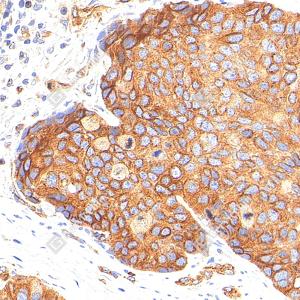 IHC检测PI 3 Kinase p55 gamma蛋白(货号 GB115763). 样品: 人食管癌, 4%多聚甲醛 (货号G1101) 固定12-24小时. 抗原修复: 柠檬酸抗原修复液(干粉, pH 6.0) (G1201), 98℃, 20分钟. —抗: 1: 300稀释, 4℃ 孵育过夜. 二抗: S-vision免疫组化多聚二抗(山羊抗兔),即用型 (货号G1302), 室温孵育20分钟. |