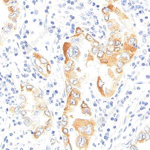 IHC检测PI 3 Kinase p55 gamma蛋白(货号 GB115763). 样品: 人结肠癌, 4%多聚甲醛 (货号G1101) 固定12-24小时. 抗原修复: 柠檬酸抗原修复液(干粉, pH 6.0) (G1201), 98℃, 20分钟. —抗: 1: 300稀释, 4℃ 孵育过夜. 二抗: S-vision免疫组化多聚二抗(山羊抗兔),即用型 (货号G1302), 室温孵育20分钟. |