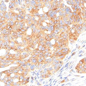 IHC检测PI 3 Kinase p55 gamma蛋白(货号 GB115763). 样品: 人卵巢癌, 4%多聚甲醛 (货号G1101) 固定12-24小时. 抗原修复: 柠檬酸抗原修复液(干粉, pH 6.0) (G1201), 98℃, 20分钟. —抗: 1: 300稀释, 4℃ 孵育过夜. 二抗: S-vision免疫组化多聚二抗(山羊抗兔),即用型 (货号G1302), 室温孵育20分钟. |